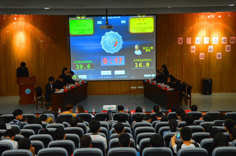 经过前期初赛、复赛和半决赛的激烈角逐,来自2015级应用化学1班和2015级应用化学6班代表队挺进决赛。辩论双方以 “大学生应不应该将手机带入课堂”为题展开辩论。辩手们经过开篇立论、双方攻辩、自由辩论、总结陈词等各个环节,双方引经据典、旁征博引,不时引发现场观众热烈的掌声。最后,2015级应用化学1班代表队夺得冠军。