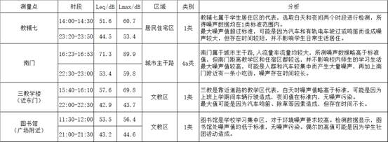 学校属于1类区,适用于1类区标准。由上述数据分析得,学校的声环境总体质量较高,给学生提供了良好的学习生活环境。对于偶然出现的噪声,实验团队给出以下几点建议:①在学校里可以倡议同学们多植树(比如在植树节的时候),可以减少一些噪声污染;②在学校的道路主干上树立禁止鸣笛的指示牌;③在学生上课期间不除草或减少除草、不修筑建筑以减少噪声。