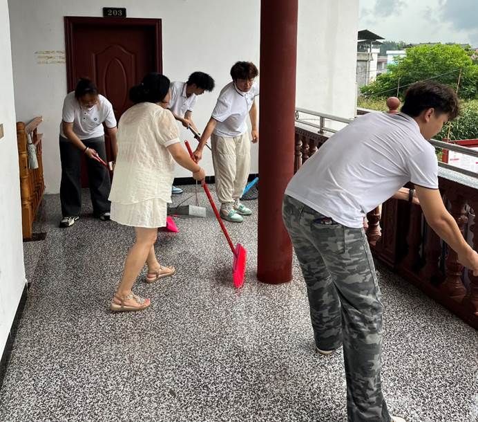活动中,实践团成员针对村委会二楼楼道、房间雨水积水情况,及时开展积水清洁工作。确保在最短时间内恢复楼道、房间的干净整洁。