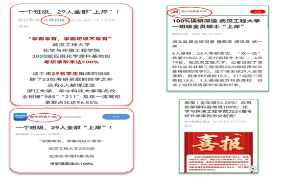2024届本科就业率97.16%,考研上岸153人,录取率54.26%,1个班级录取率100%,10个宿舍录取率100%。其中双一流高校录取人数占总录取人数的62.75%。应用化学理科基地班上岸率100%事迹被人民日报、新华网、湖北日报、青春湖北等国家级和省级主流媒体报道。学生积极参加双创竞赛并获得32项A类赛事国家级奖项,大学生创新创业训练计划项目获批国家级9项,省级18项。