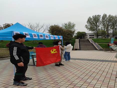 的同学们踊跃参加了此次活动,留下了一道道靓丽的身影,形成了校园独特的风景线。与此同时,活动负责人给参与活动的同学普及了党旗的由来和意义,加深了同学们对党的了解。