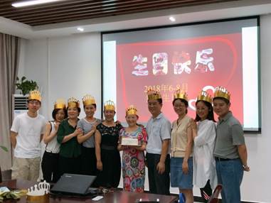 分工会正在为6、7、8月过生日的老师举办集体生日会,这也是本学期举办的第二场生日会。生日会由工会副主席程璟老师主持。