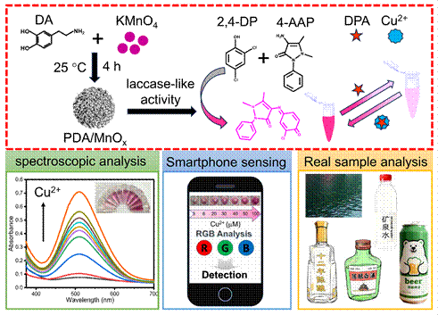 Cu2+作为人体内常见的微量元素,在多种代谢活动中发挥着关键作用,但其浓度失衡也会导致多种疾病。由于酒精酿造中常使用铜质设备,易导致酒精饮品中Cu2+污染,因此准确检测酒水样品中的Cu2+含量对保障食品安全至关重要。本文通过在室温下搅拌的简易方法一步制备了PDA/MnOₓ纳米颗粒,该纳米粒子具有优异类漆酶活性,能催化氧化2,4-二氯苯酚,并与4-氨基安替比林反应生成粉色产物。D-青霉胺(DPA)作为MnOx的蚀刻剂及Cu2+的螯合剂,可介导PDA/MnOx纳米颗粒的漆酶样活性。基于此,我们构建了一种信号开启型比色检测体系用于Cu2+的高灵敏检测。此外,与智能手机结合,通过色彩识别APP也可实现多种酒水样品中Cu2+的无仪器现场分析。该方法为设计基于纳米酶的重金属离子比色传感器提供新策略,在饮品安全监测中具有重要应用潜力。