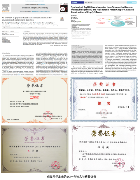 高度重视“互联网+”全国大学生创新创业竞赛、全国大学生化学实验技能竞赛,全国大学生化学实验创新设计大赛等学科竞赛。班级同学积极参与,取得了喜人的成绩。其中,黄涛同学以第一作者在国际学术期刊上发表SCI收录论文1篇,夏旭领、朱启龙同学以共同第一作者在国际学术期刊上发表SCI收录论文1篇,苑志强、白亦可均以第四作者发表SCI论文共2篇,董双凤以第三作者发表中文论文1篇。苑志强、周靖淞、刘晓玲同学组队参加第二届“微瑞杯”全国大学生化学实验创新实验设计竞赛并荣获华中赛区二等奖1项。全班多名同学参加湖北省第十三届、第十四届大学生化学(化工)学术创新成果报告会,并荣获一等奖1项,二等奖2项,三等奖2项。周靖淞同学在多次参加创新大赛,并荣获2020年“互联网+”金奖1项、铜奖2项,荣获2021年“互联网+”银奖1项,2021年“挑战杯”红色专项活动二等奖1项,2020年“挑战杯”获银奖1项。董双凤同学荣获海角视频