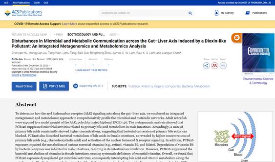 (通讯员邱心泓)近期,环境科学与工程领域顶级期刊Environmental Science & Technology(ES&T)在线发表了我校海角视频 胡陈艳老师的研究论文“Disturbances in Microbial and Metabolic Communication across the Gut–Liver Axis Induced by a Dioxin-like Pollutant: An Integrated Metagenomics and Metabolomics Analysis”(第一作者:胡陈艳,第一单位:海角视频 )。 作为典型持久性有机污染物,多氯联苯(PCB)在环境中停留时间长,毒性大,易积累。类二噁英多氯联苯PCB126是环境污染和生物蓄积最为广泛的一种同系物,其主要毒性作用途径是通过结合、激活芳香烃受体信号通路(AhR),进而诱导下游生物化学变化。已知AhR信号紧密调节肠道微生物群落的组成和代谢功能,但是AhR信号激活后如何进一步在生物体的肠肝轴(gut−liver axis)传导还缺乏研究。胡陈艳老师等利用成年斑马鱼为模式生物,急性暴露于2nM PCB126 7天,暴露结束之后,综合运用宏基因组学及代谢组学等分析方法,系统研究AhR通路激活后、跨微生物-肠道-血液-肝脏信号网络的变化。研究结果表明,PCB126显著抑制雄鱼肠道内初级胆汁酸代谢相关的微生物代谢活动,导致一系列初级胆汁酸的肠道浓度升高。在雌鱼肠道,PCB126同样干扰胆汁酸的细菌代谢活动,导致初级胆汁酸浓度升高、法尼酯X受体(nuclear farnesoid X receptor)通路激活。另外,PCB126的暴露也损害多种重要维生素的代谢,例如阻碍雄鱼肠道内维生素B6的细菌降解活动,抑制雌鱼肠道内维生素的微生物代谢、导致重要维生素的系统性缺乏等。总之,这一研究发现PCB126介导的AhR通路激活会明显干扰肠道微生物的生理代谢活动,沿肠肝轴扰乱胆汁酸及维生素的跨器官信号网络。研究发现为AhR调控肠道微生物与宿主相互作用提供深层次证据,为类二噁英POPs的环境健康危害及风险评估提供理论依据。ES&T杂志是美国化学会的旗舰期刊,也是环境类的顶级期刊,为中科院环境大类一区和JCR一区期刊,当前影响因子为7.864。这一研究主要由胡陈艳老师与中国科海角视频 水生生物研究所陈联国研究员(论文通讯作者)合作完成,论文链接为:。(审稿:董志兵)