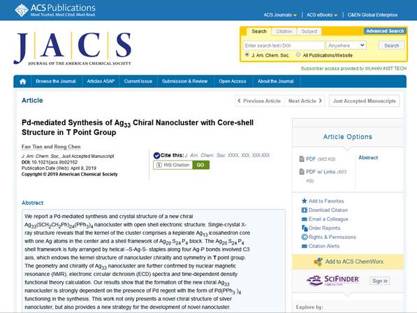 2019年4月8日,化学领域国际顶级期刊《美国化学会志》(Journal of the American Chemical Society, JACS,影响因子14.357)在线发表海角视频陈嵘教授课题组在Ag基纳米团簇方面取得重要进展——“Pd-mediated Synthesis of Ag33Chiral Nanocluster withCore-shell Structure in T Point Group”(唯一通讯单位,唯一通讯作者)。该论文的第一作者为海角视频应用化学专业在读博士研究生田凡,这也是海角视频研究生首次在世界顶级学术期刊上发表学术论文。更值得一提的是,田凡同学是海角视频2009级应用化学专业本科生、2013级应用化学专业硕士研究生、2016级应用化学专业博士研究生,是在海角视频