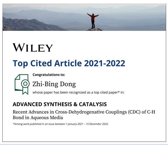 董志兵教授课题组在国际著名有机化学期刊《高等合成催化》Advanced Synthesis & Catalysis发表的论文“RecentAdvances in Cross-Dehydrogenative Couplings (CDC) of C-H Bond in Aqueous Media”入选Top Cited Article(2021-2022),该论文同时也入选WEB OF SCIENCE数据库高被引论文,论文的第一作者为硕士生彭康。论文链接://onlinelibrary.wiley.com/doi/abs/10.1002/adsc.202001358