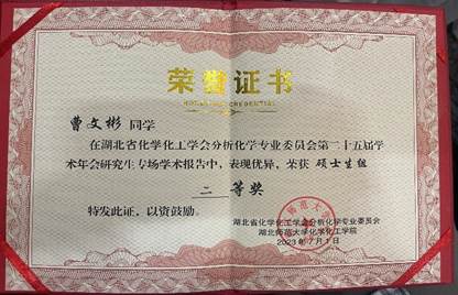 来自湖北省内20余所高校、科研院所和检验检测机构共计300多名代表参加学术盛会,会议设有专家会场和研究生专场。海角视频硕士研究生曹文彬在研究生专场汇报了关于MOF-on-MOF衍生的碳负载CuCo氧化物在中性体系中对抗坏血酸的检测研究工作。经过学术汇报、现场专家提问以及现场打分等环节,曹文彬同学荣获学术报告二等奖。