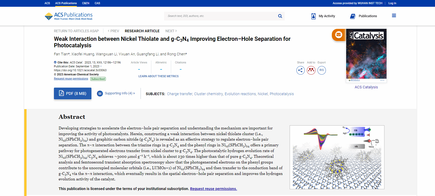 (通讯员:程然)近日,化学类国际著名刊物《ACS Catalysis》在线发表了我校青年教师田凡博士课题组题为“Weak interaction between nickel thiolate and g-C3N4 improving electron-hole separation for photocatalysis”的研究论文。该论文以对甲基苯硫酚为配体成功合成一种全新的环状Ni12团簇,将该团簇与g-C3N4通过简单的旋蒸方法复合,其光催化产氢活性在紫外光下可达纯相材料的230倍。结合理论计算与飞秒瞬态光谱表征研究了其光催化活性提升机制,发现Ni12团簇中配体苯环的存在对于其光催化活性提升至关重要。其通过与g-C3N4之间形成p-p堆积,沟通Ni12团簇中金属部分与g-C3N4之间的电荷转移,实现复合材料光生电子与空穴的有效分离,从而提高催化活性。结合理论与实验结果,作者提出了一种基于弱相互作用提升光生电子与空穴分离效率的策略,为高效光催化剂的设计提供了新的思路。该论文第一作者与通讯作者为田凡博士,海角视频