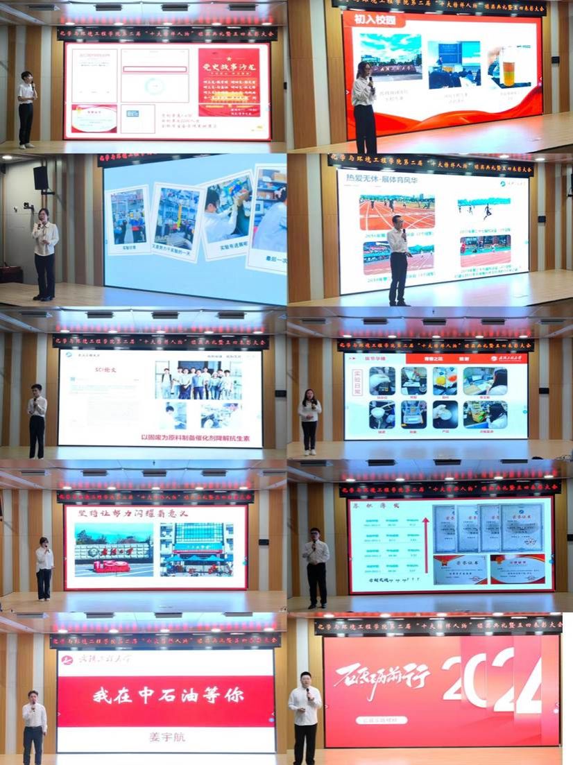 学风创优榜样杜静、公益实践榜样杨田雨、学风创优榜样张赫、高端就业榜样姜宇航、学风创优榜样孟高德、学风创优榜样吴雨溪、体育竞技榜样刘钦、科技创新榜样付玮、学生干部榜样赵吉祥、学风创优榜样李文婕共十位优秀化环学子发言,他们在学风创优、公益实践、高端就业、体育竞技等领域做出了突出贡献,展现出坚定的信念和执着的追求,为大家树立了榜样。