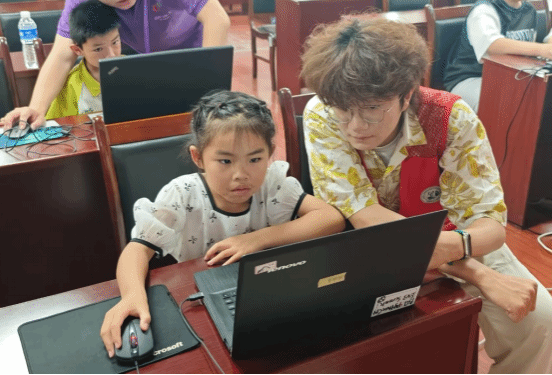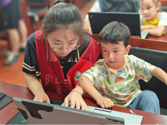 活动中,志愿者们为小朋友们科普编程的主要概念和基础知识。通过通俗易懂的语言和形象生动的例子,让孩子们快速对编程产生兴趣。同时,为进一步加强小朋友实践动手能力,志愿者们在台下“点对点”手把手地教小朋友们进行编程操作,真正实现了1v1教学科普,确保每一位小朋友都能得到充分的指导和帮助。
