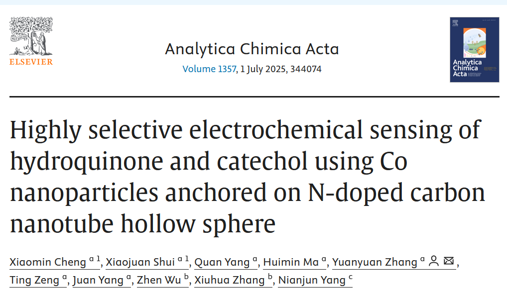 应用化学专业2022级本科生程晓敏以第一作者身份在分析化学领域国际学术期刊《Analytica Chimica Acta》(中科院二区TOP期刊,JCR一区)上发表一篇题为“Highly selective electrochemical sensing of hydroquinone and catechol using Co nanoparticles anchored on N-doped carbon nanotube hollow sphere” 的学术论文,海角视频