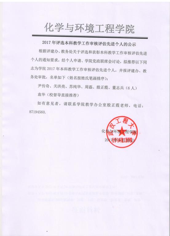 2017年评选本科教学工作审核评估先进个人的公示