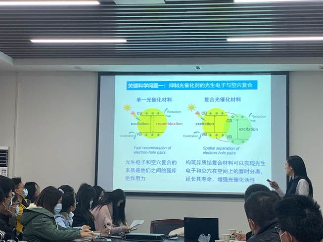 王靖宇教授在报告中主要介绍了三部分内容:1)π共轭材料基高效复合光催化剂的组装方法与界面调控策略;2)有机聚合物多孔复合材料的构建;3)高效气吸附-光催化转化系统。从背景与研究意义入手,以关键科学问题为引导进行了此次学术报告。两位教授的报告内容新颖、见解独特,引起了在座师生的兴趣。学术报告结束后,王得丽教授和王靖宇教授回答了在场师生提出的学术问题,并与师生进行了深入的讨论。