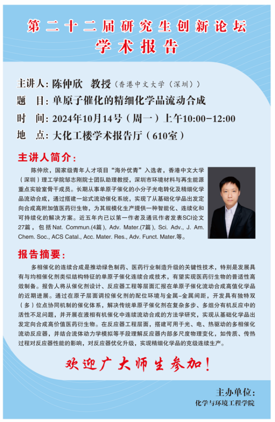 【研究生创新论坛】单原子催化的精细化学品流动合成